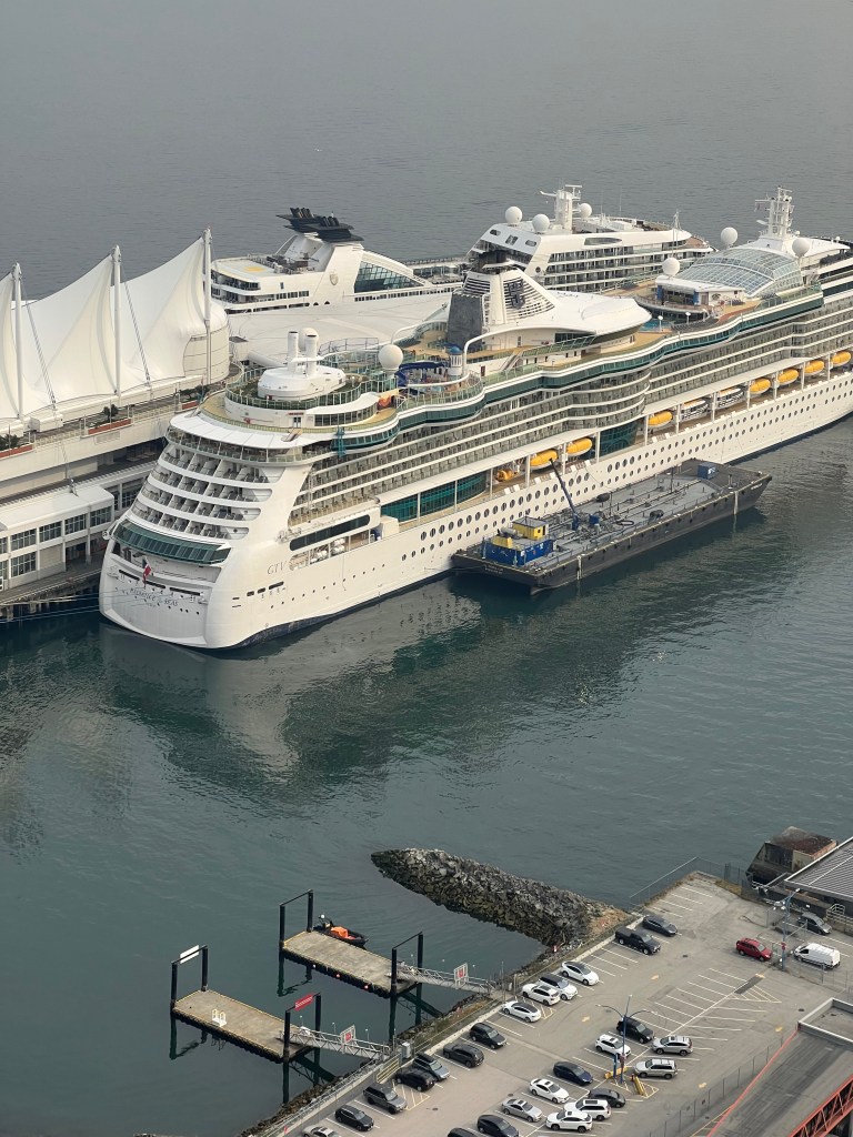after the Lookout we walked around downtown and the sea walk. We saw the Fairmont Pacific Rim, which connects to the cruise terminal. I was happy we stayed away from the crowds and busy but if you don’t want to Uber ( Vancouver has and Lyft) to the cruise terminal then it’s a great location as you can walk right into the ship with all your luggage but defiantly busy! We picked up our luggage from the hotel storage and got to an Uber the cruise port. It was around $25.00 for a midsized SUV