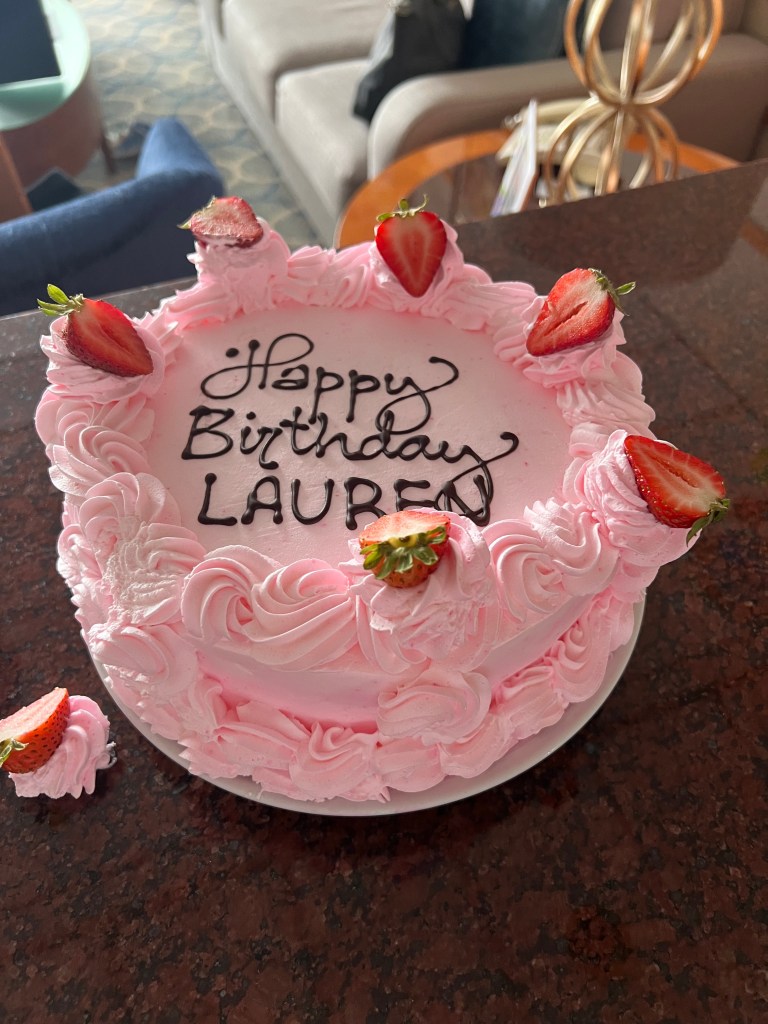 The Vancouver cruise terminal is busy. There is one terminal, one customs and one security for all cruise lines. We were in a suite and there was a suite departure line. The regular line moved faster in all honesty and was easy. Bags go through security and people through metal detectors then on to customs. The customs line was long and took over half an hour. We choose our boarding time closer to 1pm because the crowds are typically less and it gave us more time to explore the city. I was happy we did as it took us almost an hour total to get through security and customs with the lines. We usually prefer to board cruises later due to the crowds on the ship being high as no ones room is ready yet. We also prefer to carry on own luggage on the ship and go right to the room. We did our muster station drill through the app and visited our muster station to finish check in. Once we did that, we went to our room. The room keys are on your door. My family had surprised me with a Royal Caribbean birthday package. The room was decorated and there was even a gluten free cake waiting. It was a really sweet surprise and a great way to celebrate my last year in my 30’s. We unpacked and hung out on the balcony as the ship left the harbor. The views were great!