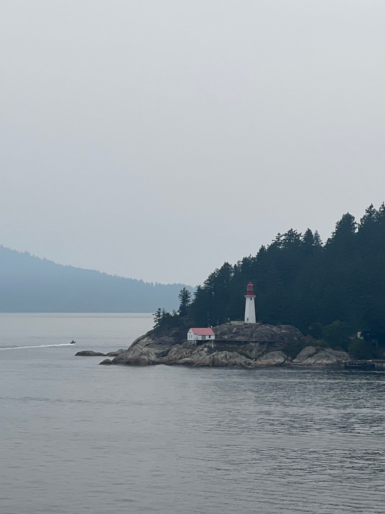 I booked the Fairmont downtown (here are three Fairmonts in Vancouver) using my American Express platinum card. We found out once we arrived we’d been upgraded to a club level room that included a fantastic free breakfasthat day and many other perks we didn’t get to experience due to having to check out. Since we had to check out at noon but wanted to explore Vancouver, we had our luggage held by bell services. After checkout we went to the Vancouver lookout. We arrived right when they opened, which I highly recommend as it quickly crowded. The views were great, even with the wildfire haze. We saw our ship from the top.