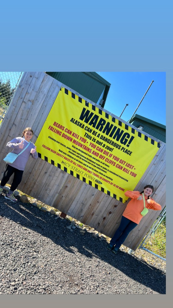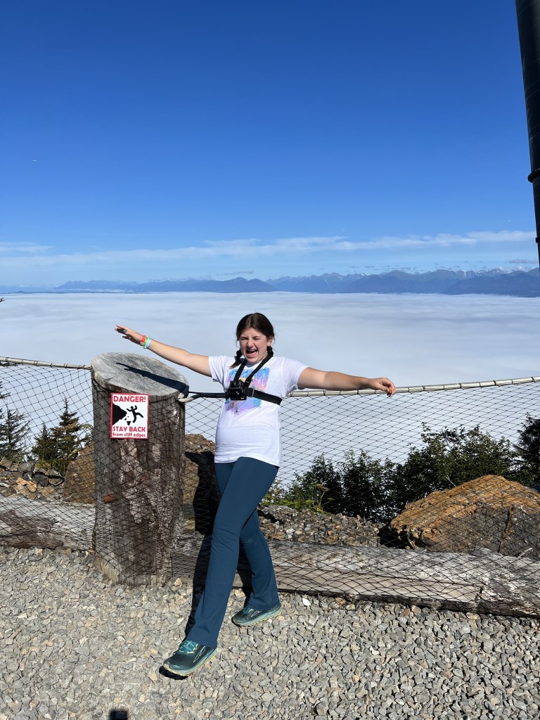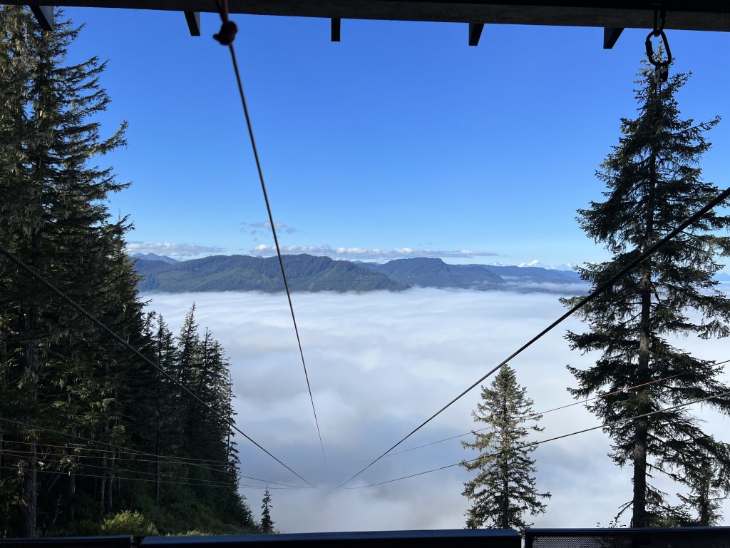 After the hike, it was time for Ela and Jered to zipline. Ela’s mission this year has been to defeat her fears. I was so proud of her for doing this. She was SO nervous. They had the absolute best time. It’s a one time ride, but they would have ridden over and over again. They start off at the top and strap you in. If you watch our Youtube on Icy Strait Point, the whole experience is on there. Ela said as you fly down the mountain, you can see the line of clouds below, glistening in the sun. As you descend, you fly through the clouds. Both Jered and Ela had the best time.
