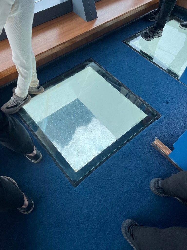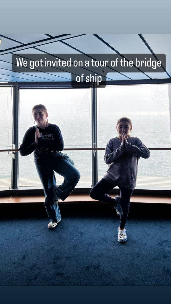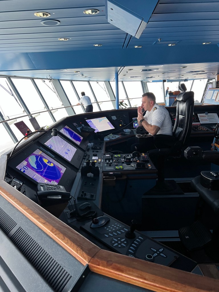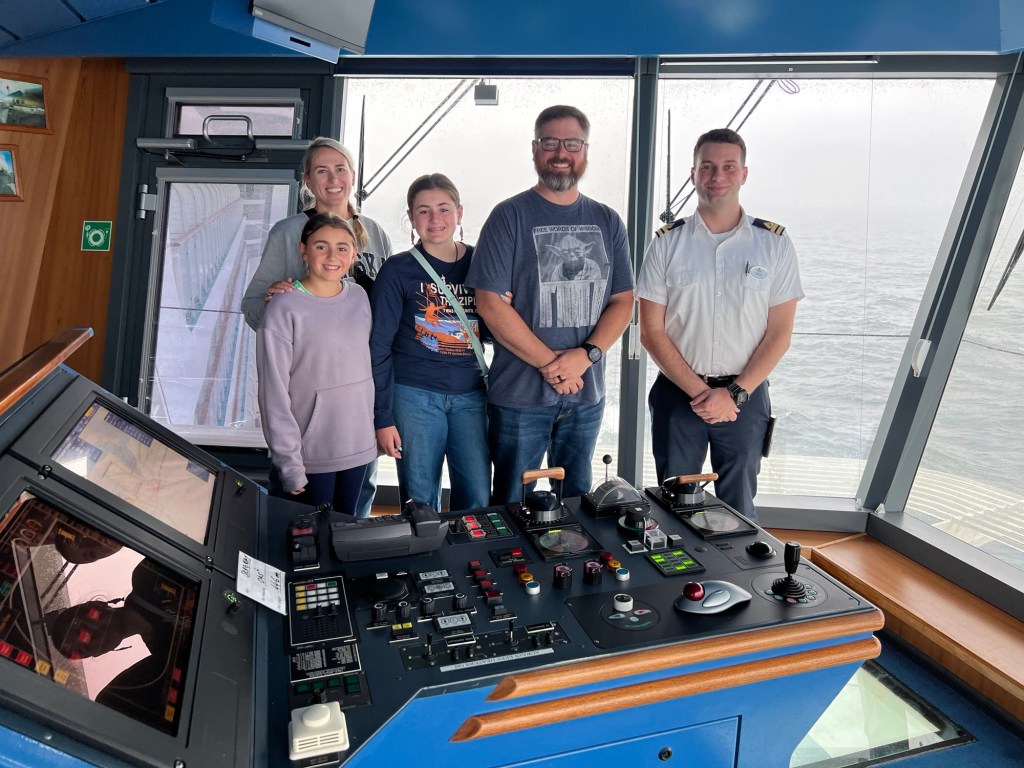 The boat seemed to shudder to a stop, the engine noise changed and the wake stopped. After a short minute, the boat resumed but at a slower speed. There were no announcements and the crew didn’t seem worried so we figured everything was okay. After bingo, we made our way up to the captains bridge. We had been invited to meet the captain and tour the bride. At this point, we were having trouble walking. The boat was really rocking. We all felt unstable. We made it the captains bridge and got to tour it. The captain had to take care of something (maybe a broken engine…?) and was not able to be there. We still were able to meet several crew members and see how the ship was run.